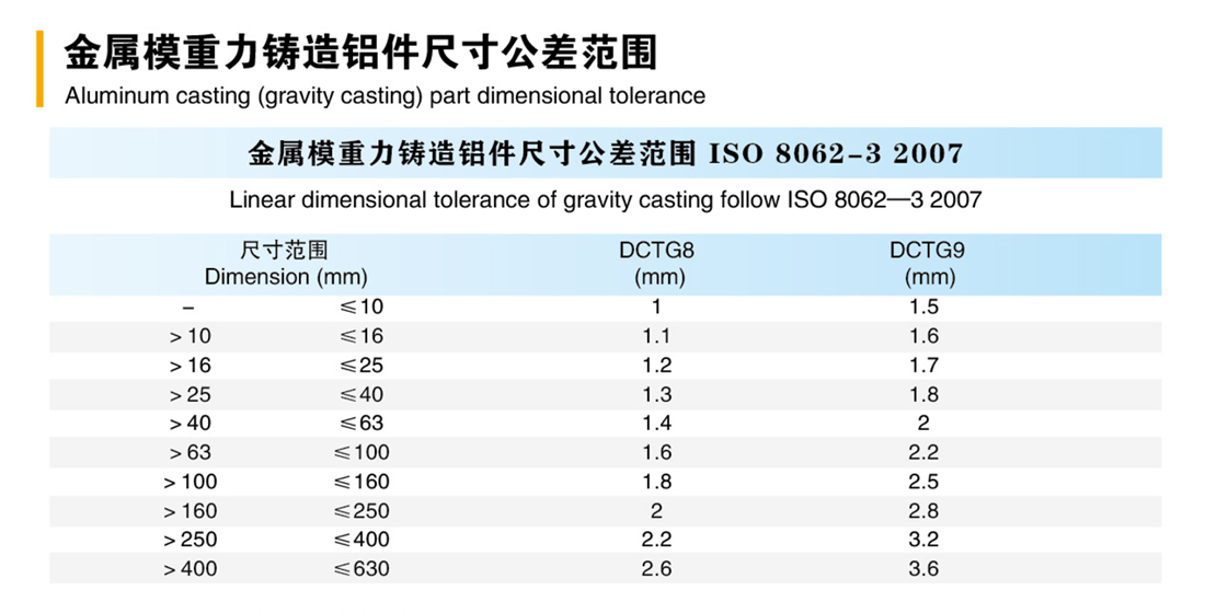金屬模重力鑄造鋁件尺寸公差范圍